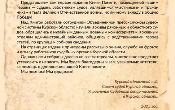 В преддверии Дня Победы сотрудники судебной системы Курской области выпустили первое издание Книги Памяти, посвященной судьям и работникам судов, которые участвовали в Великой Отечественной войне или трудились в тылу.
