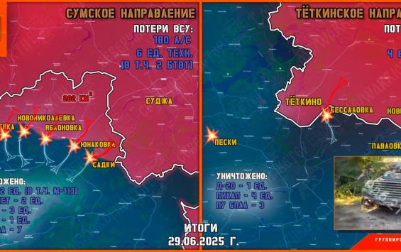 На приграничных территориях Курской области зафиксировано снижение активности украинских вооружённых формирований на Тёткинском и Глушковском направлениях. По имеющимся данным, от села Бессаловка в направлении российской границы была выдвинута штурмовая группа из состава 158-й отдельной механизированной бригады ВСУ. В ходе стрелкового боя украинские военнослужащие понесли потери в живой силе и были вынуждены отступить.