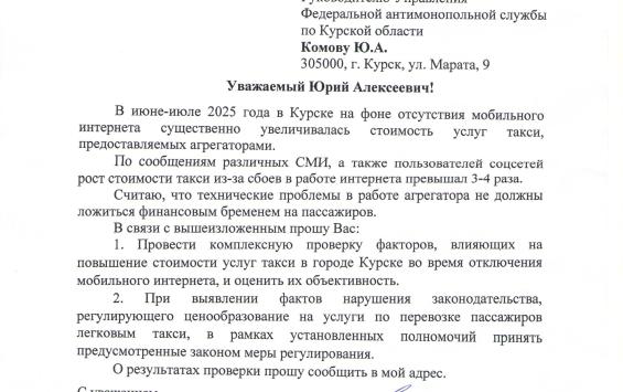Депутат Владимир Фёдоров подал обращение в Федеральную антимонопольную службу, выразив обеспокоенность резким увеличением стоимости такси в Курске. По его словам, в июне и июле тарифы выросли в 3–4 раза, что связано с перебоями в мобильном интернете.