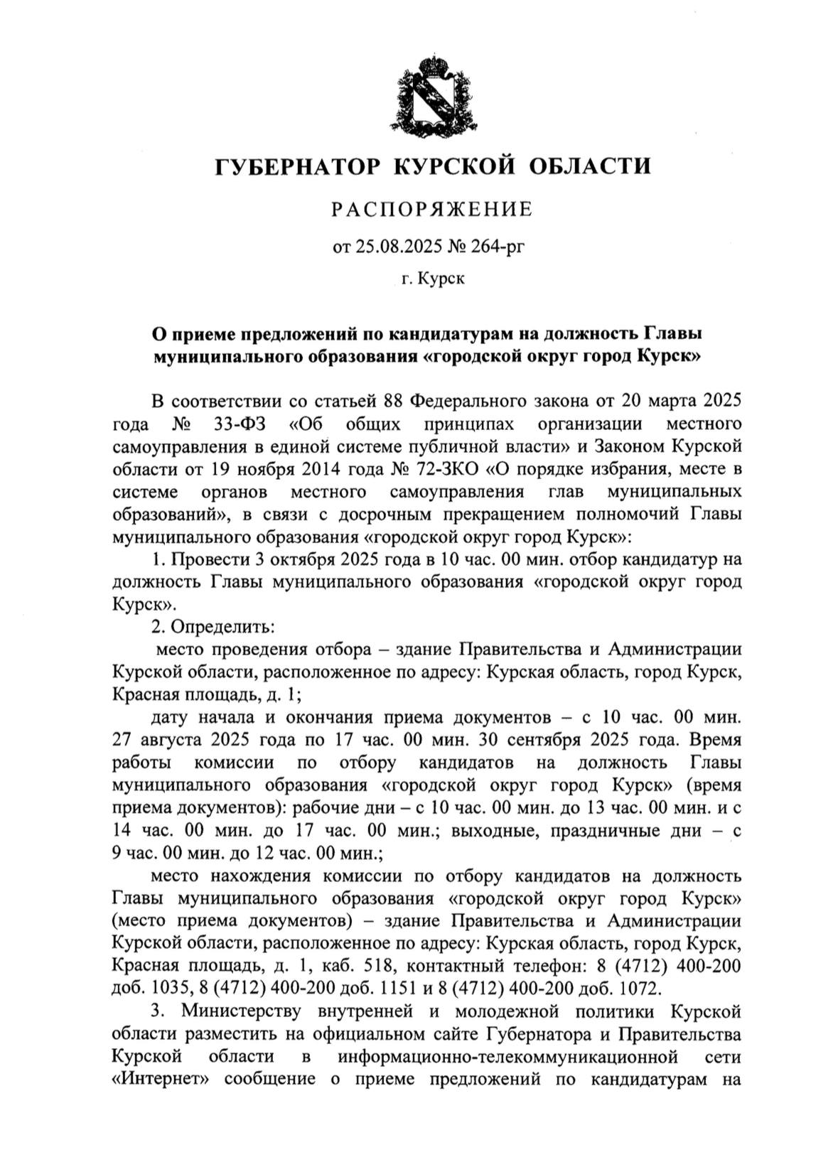С сегодняшнего дня стартовал приём заявок от кандидатов на пост главы города Курска. Соответствующее распоряжение подписано, сообщил врио губернатора Александр Хинштейн.
