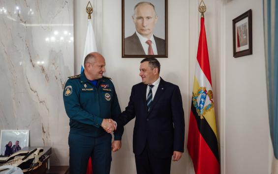 Министр по чрезвычайным ситуациям России Александр Куренков прибыл в Курскую область с рабочим визитом и встретился с врио губернатора Александром Хинштейном.
